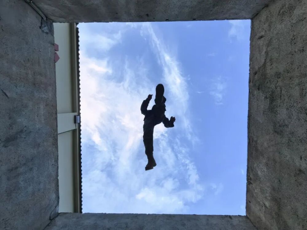 深坑之上,武警战士凌空跨越。蓝天下,他矫健的身姿,镌刻出火热青春的动人模样。