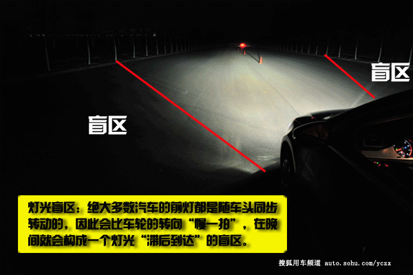 绝大多数汽车的前灯都是随车头同步转动的,因此会比车轮的转向“慢一拍”,在晚间就会构成一个灯光“滞后到达”的盲区。如果车速过快,当灯火照射到的时候车就可能撞到路边的物体或行人了,在连续弯道的地带,这种危险更大。